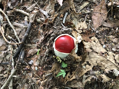 フクロウ、近くから見ると子犬の後ろ姿のよう (~~); おっ! 今年も昨年と同じ場所に〜 タマゴダケ〜 (◎◎) !!