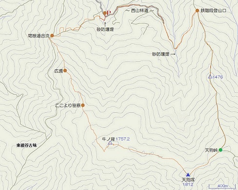 西山林道の西砂防堰堤から天狗塚経由で鉄階段登山口への周回ルート