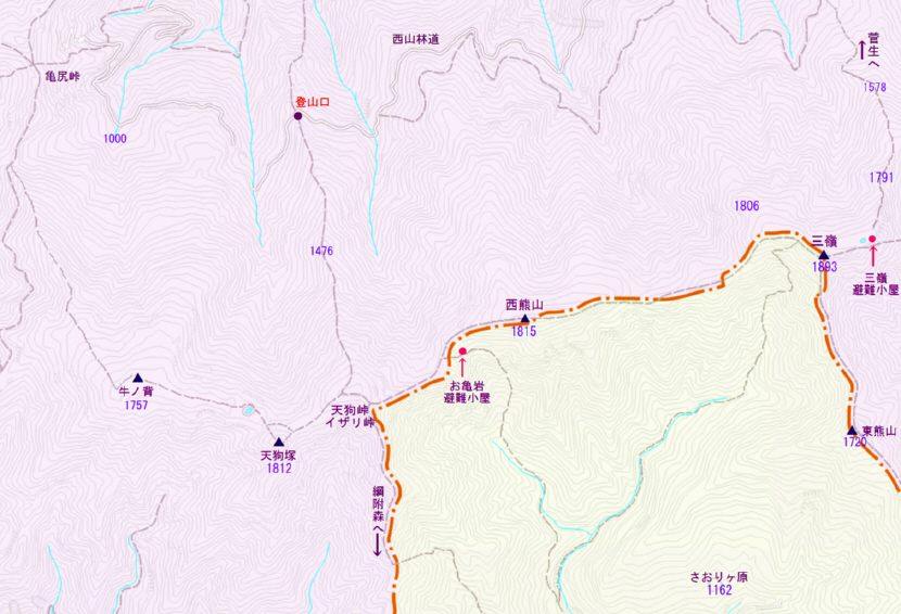 上図は西山林道を起点に、亀尻峠 〜 牛ノ背 〜 天狗塚 〜 西熊山 〜 三嶺 〜 菅生ルート