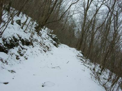 真っ白になった林道を南へ歩くとすぐに作業道の入口があったので、これかなぁ〜と思い上がってみる