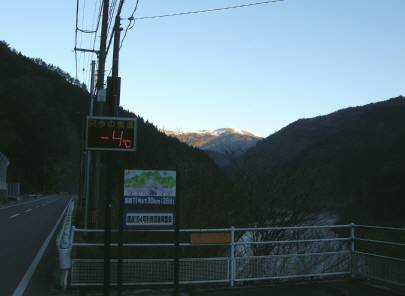 朝7時30分、194号線の大橋貯水池(吊り橋)にて平家平を見る ・・ 温度計はマイナス4℃!