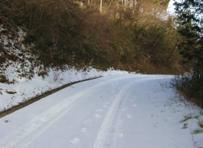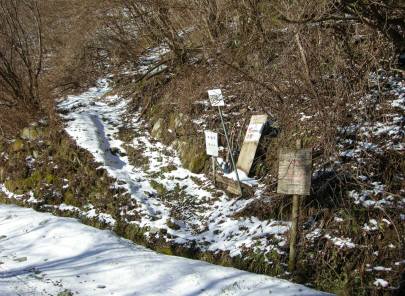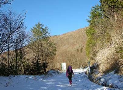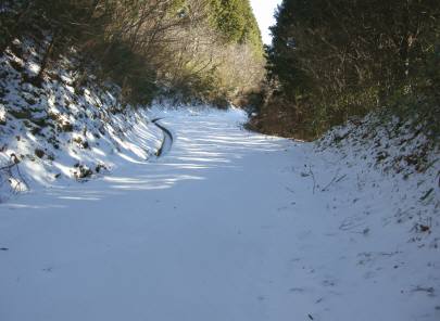 高藪土居の最終民家を過ぎると早くも林道は雪道になってきた