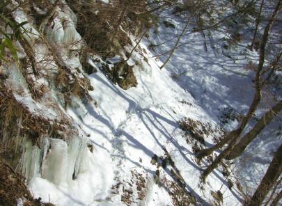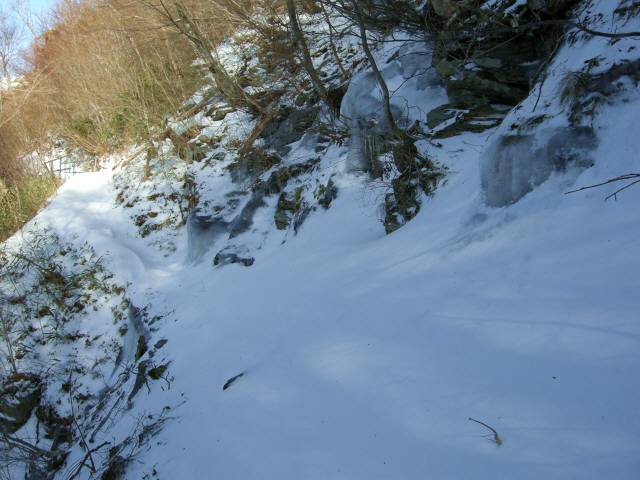 左側は谷なので慎重に進むが、この凍りついた道はちょっとキビシイ (++);
