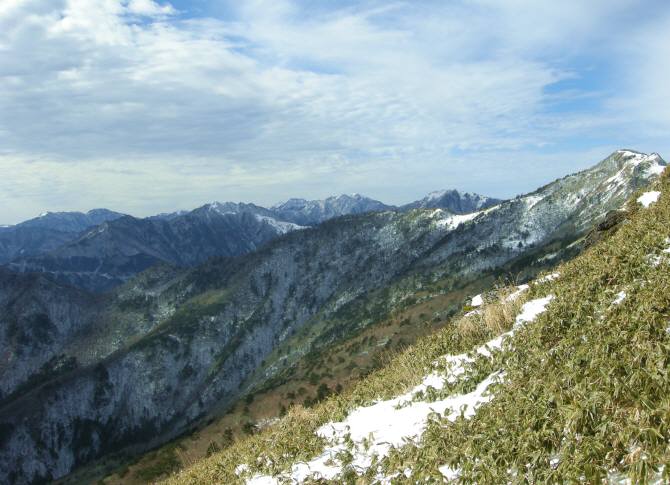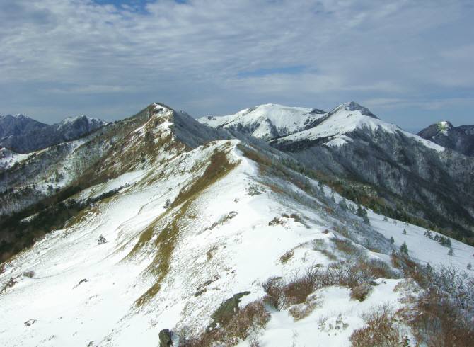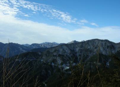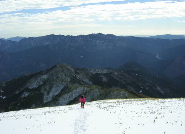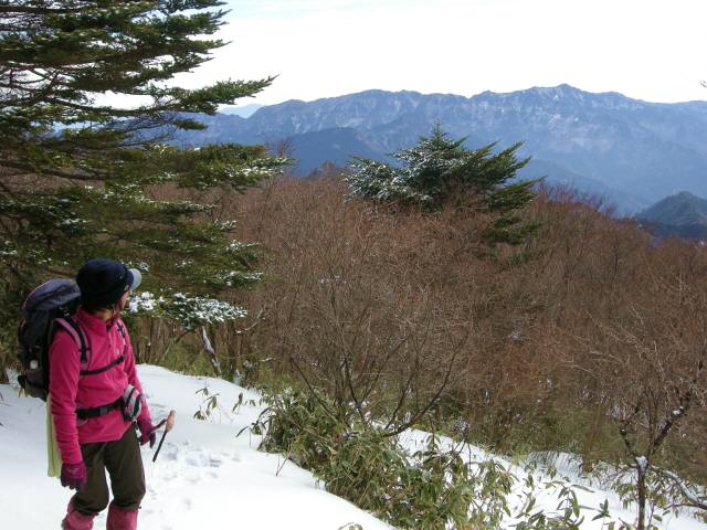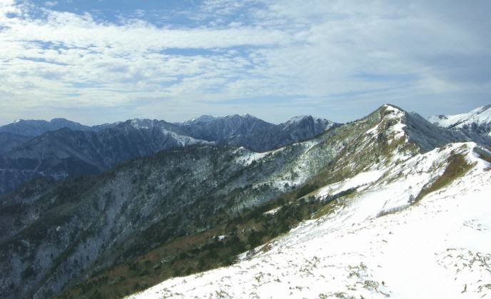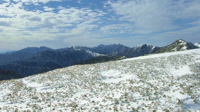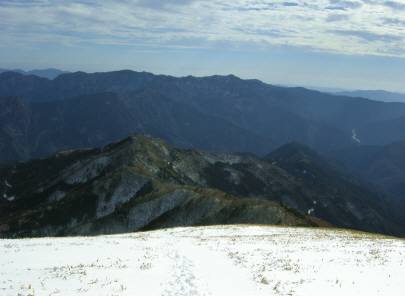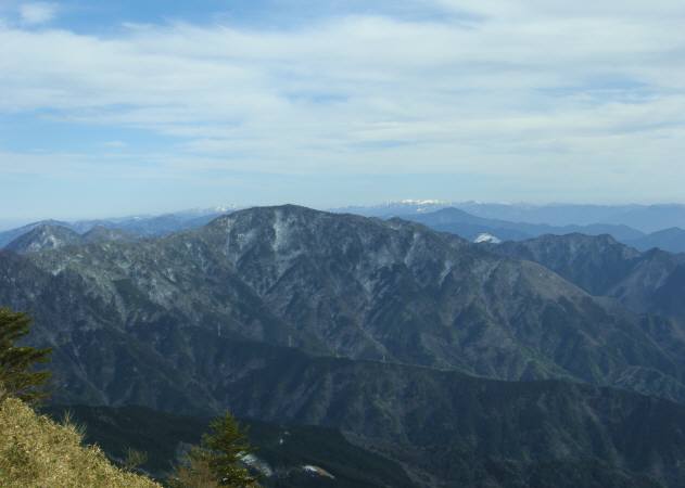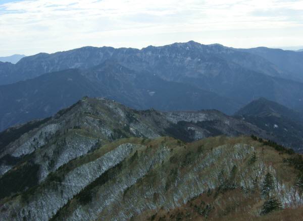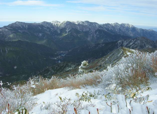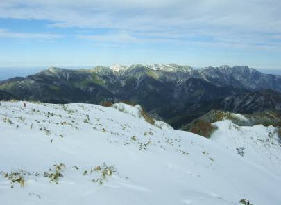 東方向には近くに大座礼山が聳え、奥には白くなった剣山系も確認できる