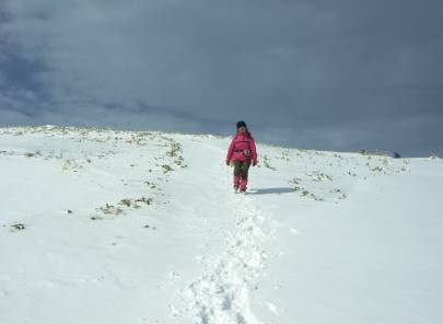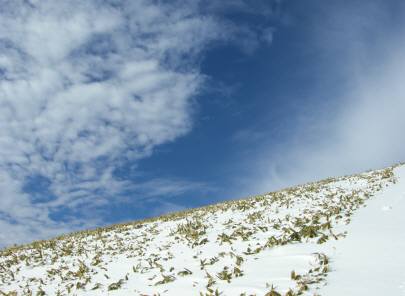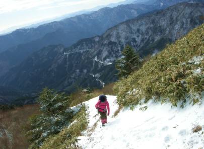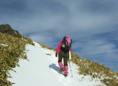 再び雪の斜面へ復帰し、アイゼンと尖ったストックで道を作りながら進む