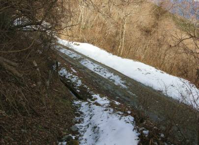 登る時に苦労した凍り場を通過 登山口からは長い林道歩きの始まり