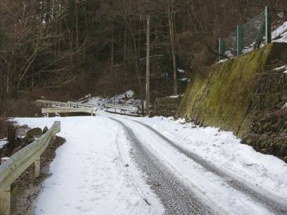 雪が降る中、程野の入り口を過ぎて「わらじコロッケ」のお店(休業中)の前でストップ