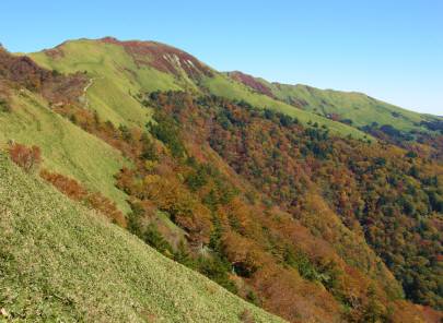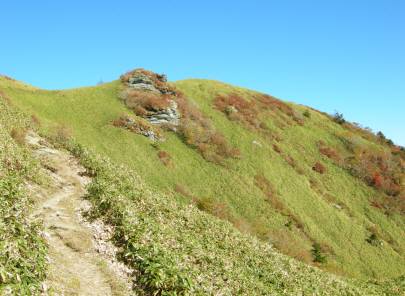 後方の紅葉した寒風山を見る、この付近の笹道が今日一番暑かった場所で温度計は20℃に上がっていました