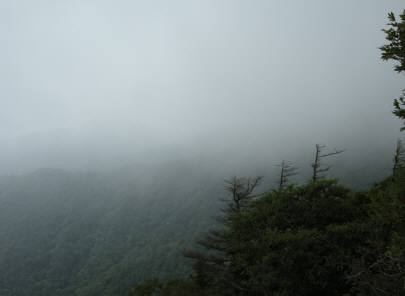 分岐近くまで戻ると次郎笈は雲の中 ! 先ほどまでいた場所は 黒から白のガスに変わっているので一安心 !