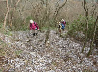 この道は約1時間ほど登りばかりが続きます。 春に来た時は日当たりの良さにバテましたが今日は日差しも無く寒いです。