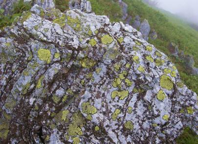 複雑な気持ちで歩いていると、 横にはキラキラした岩、そして足元には、 ん ? アキノキリンソウ ?